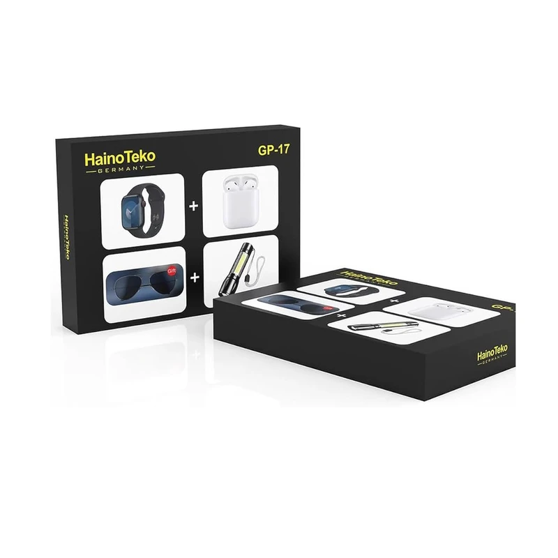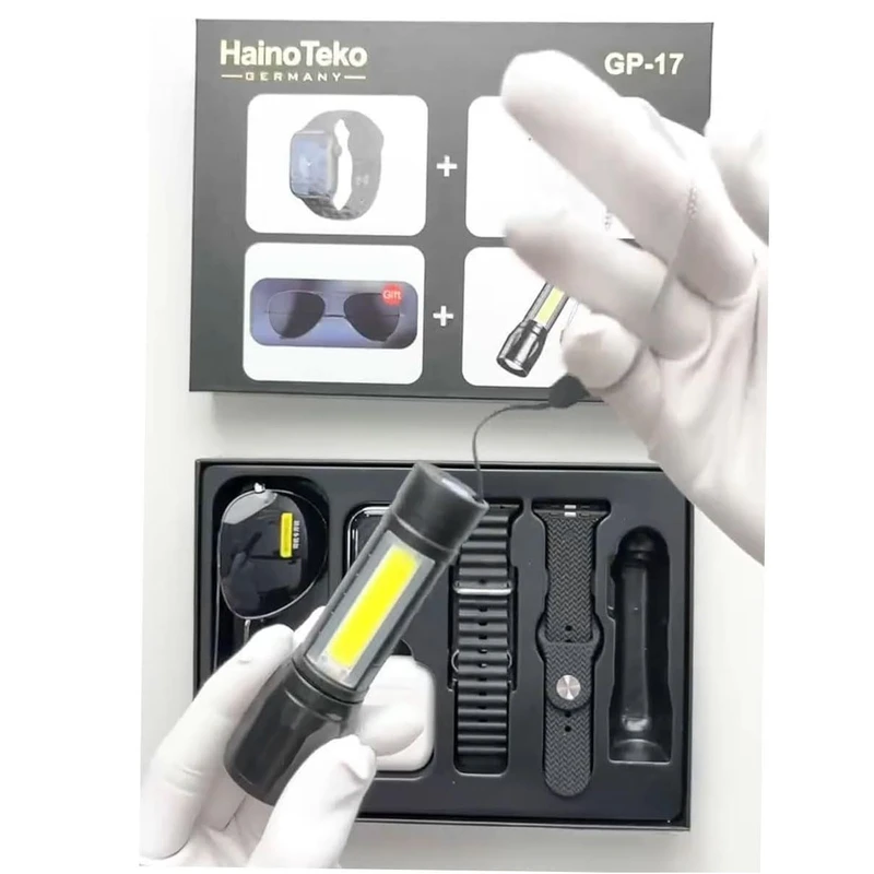 شارژر، دفترچه راهنما، کابل شارژر وایرلس، یک عدد عینک آفتابی، یک جفت ایرباد درون باکس جداگانه، یک عدد چراغ قوه، ۲ عدد بند